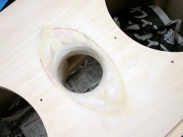 | フロントバッフルに貼付け、裏側からライトアップ。まずは、カッターで穴部分のシールを切り取り、次にガイドに沿ってヤスリで削っていく。外にいくに従って徐々に緩やかなアールを描くよう、慎重に削っていく。右上は削り終わった状態。 | |||