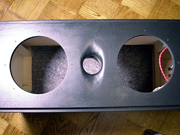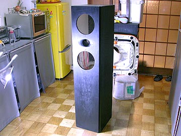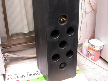 | 穴にはゴム栓で蓋をした。これで、いつでも砂の出し入れができる。これにてスピーカー本体の作業は完了!落ち着いてはいられない。作業はまだあるのだ。試聴とバーンインをしなければ。それに梱包作業という大仕事が残っている。完成したスピーカーの全貌と試聴風景はColossaltowerの製作その5:完成と試聴にて。 | |||