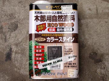 | いよいよ塗装をおこなう。使ったのはエコウッドカラーステインというステイン。油性なのか水性なのか、いまいち不明なのだが、とにかく良い発色をするステインなのだ。説明書きにはハケで塗るように書いてあるが、私は布で刷り込んでいった。濃い場合にはエコウッド専用の薄め液でやるらしいのだが、私は薄めずに塗込んだ。手に付いたカラーステインの洗浄は油性の薄め液で落とせる。しかし、このカラーステイン、手に付いたらなかなか取れない。おかげで手は薄黒くなってしまった。 | |||