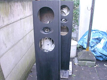 | ツイーターを固定する。うむうむ、思惑とおりにがっちり固定出来たぞ!さらに、ツイーターへの配線もおこなう。ここはネジ留め。配線が外れないようターミナルを思いっきり締め上げる。写真には写していないが、FE208EΣもネジ留めした。さぁ、ここまでくればあと少し。いよいよ最終段階に入る。底面への砂の投入だ。砂は近くの砂利業者で購入した細かい川砂。30kg入りで\525だ。 | |||