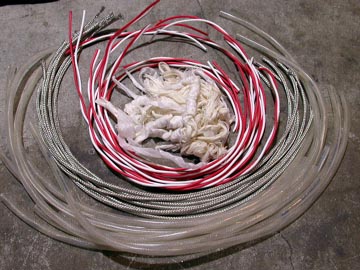| 全てばらした状態。外側から、外装シース/シールド/芯線/充填材。手持ち分では足りなくなったので、SPK-3100を追加で購入。 | |||
