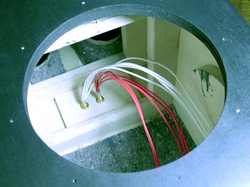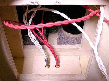 | ターミナル取付板にターミナルを挿入し、裏からナットで締め付ける。実はこのナット締め付け作業はかなり手こずった。細いとは言え5本もの芯線を束ねたため、ナットを通しにくくなってしまったのだ。数時間の格闘の末、なんとかナット締めも完了。さらに、5本の配線材の内、1本はそのままに、残り4本を2本づつねじる。この2本ねじりの芯線はFE208EΣへの配線とする。 | |||