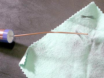 | CSコンデンサーのリード線をポリマールで磨く。酸化皮膜があっと言う間に剥ぎ取れ、ピカピカになる。目には見えないが、ポリマールには微量のワックスが含まれている。そのため、ポリマールを使った箇所にはハンダが乗りにくくなってしまう。だから、ポリマールで磨いた箇所をさらに鹿革やメガネ拭きで磨いてワックスを拭い取る。このように端末処理を行なった後、ツイーターへの内部配線にCSコンデンサーをハンダ付けする。 | |||