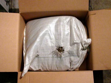 | 砂を底面の空間に投入する。乾いているのでスルスルと入っていく。砂は7合目まで入れた。片側15kgの砂が入っている。計算ではあと8kg入れられるのだが、あまりに重くすると送料がかさむので、必要があれば依頼主のところで追加してもらう事にしよう。 | |||