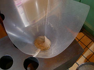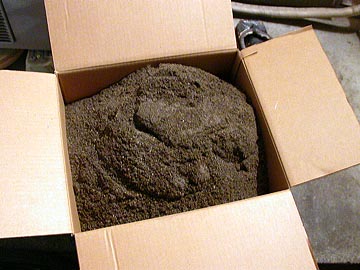 | 砂を段ボール箱に開ける。砂には水分が含まれているので、乾燥させてやるのだ。最初、ヒートガンで乾燥させていたのだが、大量の砂を乾燥させるには火力が足りずに断念。コンロで火あぶりにすることにした。普段は料理に使っている鍋を拝借。これに砂を少量入れてはコンロであぶって水分をとばす。それを10回ほど繰り返して30kg全ての砂を乾燥させた。 | |||
