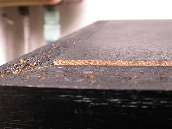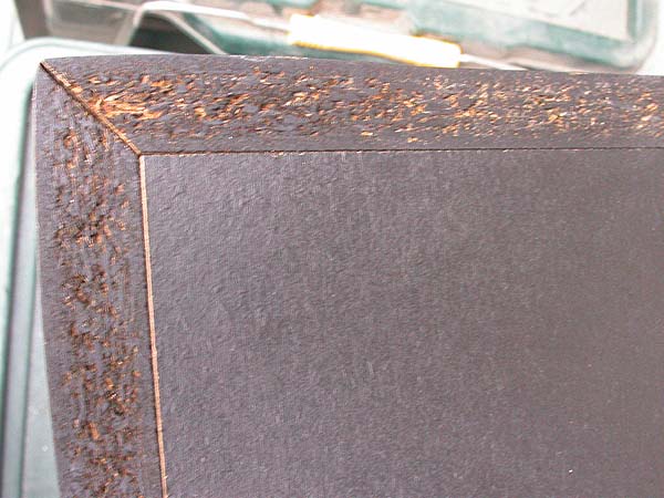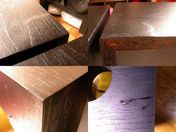 背面パネルが1mmほど膨張して突出しています。これは、私が一時期、この箱の置き場所に困り、屋外にこの箱を置いていたことがございました。そのとき、運悪く台風による横殴りの雨が降り、普段なら雨が当たらない場所においていたものの、板に水がしみ込んでしまったたため生じました。