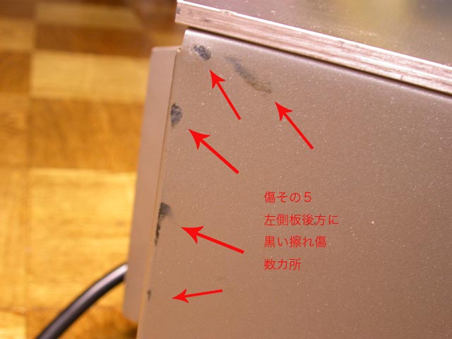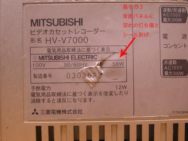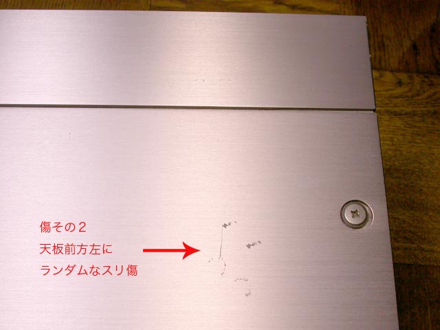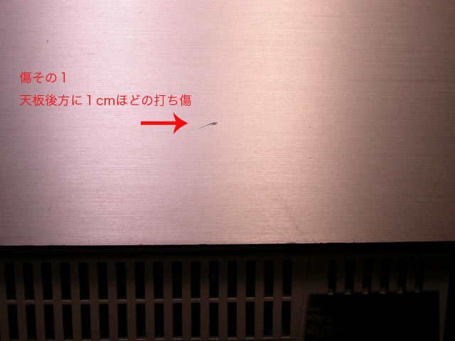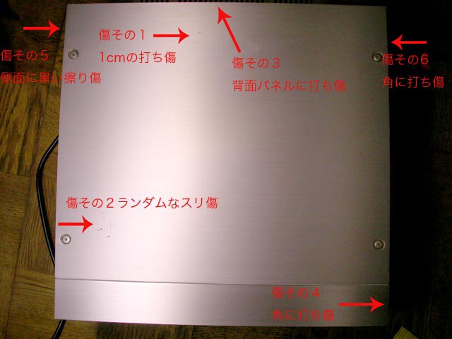オーディオみじんこ 現在ヤフーオークションに出品中のS-VHSビデオデッキにおいてフロントパネルの傷以外に、天板/側板/背面パネルそれぞれに目立つ複数の傷がありました。天板/側板/背面パネルは下記写真の目立つ傷6カ所、および使用上の細かい傷が複数あります。落札日前日でのご報告で申し訳ございません。傷の状態は下記状態をご覧ください。 |