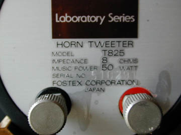 | 03.08.22 | オーディオユニオンお茶の水店でツイーターFOSTEXT825購入!\22,800(\52,000)。T825は1979年発売のプロ向けツイーター。4半世紀前のユニットがいかなる音を奏でるか?再生周波数は〜20kHzとスーパーツイーターとは言いがたい。フランジ型ホーン開口部が特徴、再生音の指向性を強める働きがある。写真のようにスリットを縦にすると音は水平に広がる。ドライバー部は外形φ8.2であり、T925と同等と思われる。