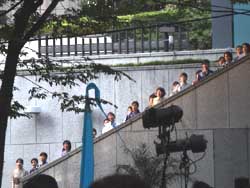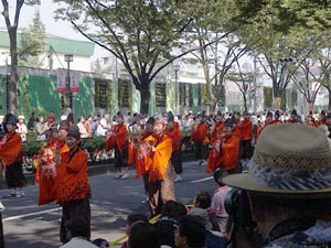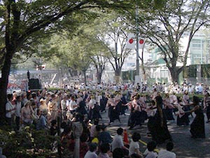 | 03.08.24 | 久しぶりに表参道へ出かけたら、原宿駅を降りた途端に「ドンドコズコズコ〜」と祭の音が聞こえてきた。ぶらぶらと表参道まで行ってみると交通規制されている。ん?ホコテン復活か?と思いきや「原宿表参道元氣祭り スーパーよさこい2003」というのをやっていたのでした。凄い!全国から集結したと思われる何十組ものよさこい踊り集団が踊りを競い合っていたのだ!表参道にはよさこい踊りと観衆が行列を成していた。各組には先導トラックがゆっくりと走行しており、エレクトロボイスのPAスピーカーをどっかり積んで音頭を鳴らしまくっていた。祭らしい音頭からテクノ調の音頭までチームよって様々。審査員席なるものも設けられていたので、ずいぶんと大規模な祭らしい。体を揺らす爆音とよさこい踊りのリズム感に興奮した次第。しかし、同潤会アパートが完全に取り壊されているのは悲しかった。写真上2枚は同潤会アパートのあったところだが、今はフェンスで被われている。祭をしばし観覧の後、カフェでまったりと過ごす。この祭については原宿スーパーステーションというHPに詳しく紹介されてました。