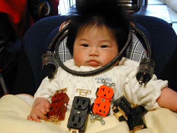 | BELDEN1506A切り売り75Ωデジタル同軸ケーブル。ダイナ秋葉原トレードセンターで10m購入。φ5。テレビ関係のインコネケーブルは全てこれに代えるつもり。1506Aは過不足ない性能ながら、\1,000と安価。プラグはスイッチクラフト。型番は忘れた。\600/ヶくらい。秋葉原ラジオストアー内でまとめて購入。これ、小さいながらも、しっかりした作り。メッキはニッケル。 | 電源ケーブルと壁コンセントに囲まれて、ご満悦の我が息子。生後3ヶ月で壁コンマニアに!?将来は良いオーディオファイルになるだろう。壁コンセントもだいぶ溜まってきた。現在、新型電源ボックスのコンセントプレートを設計中。4mm厚の真鍮を使用予定。UL規格コンセントを3ヶ搭載できるというもの。加工は近所のレーザー加工業者に頼むつもり。安く済めばいいが・・・。 | |||||||||||||||||||||||||||||||||||||||||||||||||||||||||||||||