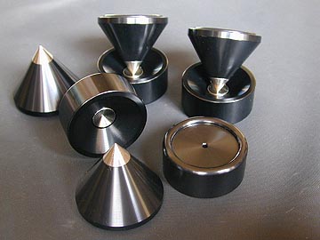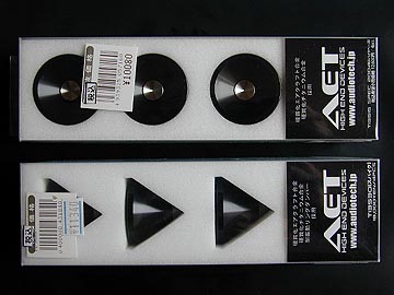 | AETのスパイク型インシュレーターTI3530とスパイクベースTI3515spec2004。6月中旬に購入。シンプルな形状がとても魅力的。音の良さで評判のインシュレーターだ。両者ともφ35と手頃な大きさ。チタニウムとアルミの複合で構成されており、極めて剛性が高い。オーディオユニオンお茶の水店4階アクセサリーフロアにて特価購入。TI3530は普通\15,000位はするものだが、旧型処分ということで4ケ入り箱が\11,340になっていた。前から欲しかったインシュレーターだったのだが、やや高値だったので購入を躊躇してたのだが、特売ということで即購入。7月下旬時点でまだ残っていたので、欲しい方はユニオンアクセサリーフロアに急げ!実はTI3530とTI3515は先月のセール開始時には旧型とspec2004とが同じ値段で特売されていた。店員さんが気付いたのだろうが、数日後に旧型だけセール特価になっていた。旧型とspec2004は形状がやや変更されている。旧型にはゴムリングが付属していたが、spec2004ではゴムリング廃止。代わりに接触面の外周が盛り上がった形状になり、コンポや床とはリング状に接するようになった。なお、TI3530とTI3515を組み合わせて使用すると、高さが4cmにもなる。追って詳しい使用状況は報告するが、TI3530はCDプレーヤーVRDS-25xsに装着している。TI3530はVRDS-25xsの脚にぴったり合うのだ。それにこのTI3530はソース機器との相性が最も良いみたいだし。 | ||||||||||||||||||||||||||||||||||||||||||||||||||||||||||||||||||