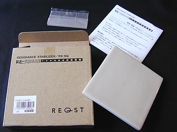 | レゾナンスチップのレゾナンス改めREQSTのスタビライザーRS-8Q。話のネタに買ってみた。\2,680。コイズミ無線で購入。発売直後から売れに売れているらしい。値段が手頃だからだろう。どこのオーディオショップにも置いてある。レゾナンスチップが有名なので、このスタビライザーにも期待が高まる。レゾナンススノーと作りは同じ焼き物で、コンポの天板に置いてやる。表面は光沢があり、底面はざらついた感じ。叩いてみるとカンカンと乾いた響きがする。軽いので、鉛のような効果効能ではないだろう。焼き物なので少々ぐらつきがある。ぐらつきには個体差があるが、私が買ったのは比較的ぐらつきが少なくてほっとした。ぐらつく場合は付属の透明ゴムを底面に貼付けて設置を安定させる。効果の程は正直不明。もっと厳密に誌聴してみないと結論しにくいのだが、こういうものの評価は難しいなぁ。 | ||||||||||||||||||||||||||||||||||||||||||||||||||||||||||||||||||