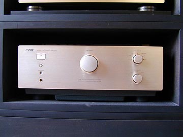AX-900ジャンク発見セリ! オーディオ店巡りをしていると、運命的な出会いがある。とはいっても、今回は他人には全く不必要なジャンク品なのだが。先月のこと、オーディオユニオン千葉店に立ち寄ったら、ビクターのプリメインアンプAX-900が棚の奥に埋もれていた。AX-900はビクターの最初で最後の高級ステレオプリメインアンプ。私も数年前に同機を入手し、分解能の良さと豪快にはじける音がえたく気に入り、現在も愛用している。飾りっけのないシンプルなフロントパネルに、同社パワーアンプM-1000に使われた巨大な鋳鉄製ベースを流用。なかなか凄みがある外見だ。このデザインは好みの分かれるところであるが、私はこういう割り切ったデザインが好きだ。 |