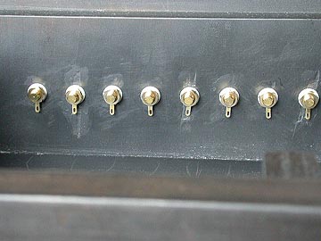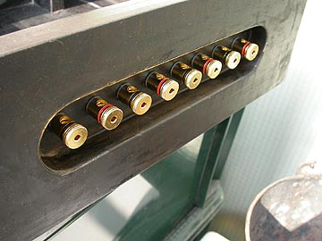 | ネットワークボックスのSP入出力ターミナル。ずらりと並んだ様子はなんともカッコ良い。このSPターミナルは秋葉原の小沼電気で購入。\550/ヶなり。片チャンネルあたり8ヶのターミナルを搭載している。中程の4本はアンプからの入力用。バイワイヤリングにすべくネットワークボックスへの入力ターミナルの段階ですでにハイパス用回路への配線とハイカット用回路への配線を別経路にしている。外側各2本づつはスピーカー本体への出力用ターミナル。右上はターミナルを取り付けた内側の様子。各ネットワークパーツはターミナルにはハンダ付けせず、すべてネジ留め固定する予定。 | ||||||||||||||||||||||||||||||||||||||||||||||||||||||||||||||||||