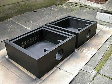 ネットワークの外付けボックス化 ここしばらくは、私の現用スピーカーPA-2のネットワークの外付けボックス化作業を行っている。下の写真がそれで、PA-2の上部に重ね置きするように設計してある。 |