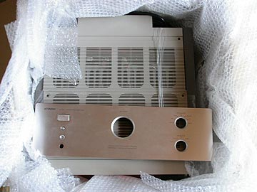 | 後日、部品取りが終わったジャンクのAX-900が送られてきた。ものはタダで譲ってもらったが、送料\3,000は私がきちんと払っている。スピーカーターミナルはリアパネルごとなくなっている。このパーツ前述の通り、別のAX-900を修理するためにビクターの修理センターへ送られたのだろう。私の所有するAX-900のスピーカーターミナルは健在なので、このパーツはなくても構わないのである。さてさて、まずはボリュームだ。ジャンク品のボリュームノブは幸い傷無しだったので、そっくり交換してやろう。なお、AX-900のボリュームはビクター独自のGMという電子制御式になっており、本当の意味でのボリュームは回路基盤上に配置されている。だから、フロントパネルのボリュームノブはGMボリュームに信号を送る役割であり、ノブの内部には回転を関知するためのセンサーと、ノブに内蔵されているLEDランプの制御基盤が内蔵されている。さらに、音量調節信号をGMボリュームに伝えるためのコードが延びている。なお、ノブ自体はプラスチック製で、重量も軽い。次にフロントパネル。これは残念ながら、やや目立つ打ち傷が付いていた。と、ここでジャンク品の検証は終了。このアンプは非常に重いので、箱から出すのが面倒。それにもともと壊れているから、動くかどうか試してみても意味がない。それにスピーカーターミナルをごっそり抜き取っているから、スピーカーをつなげることができない。万が一、電源を入れて回路がショートしたら困るし。後は私が所有するAX-900とこのジャンク品をビクター修理センター(東京都練馬区)に送ってやろう。そして、不良箇所の部品がないとなれば、ジャンク品からパーツ取りしてもらえばいい。私のAX-900とジャンク品の不良箇所が同じであれば、どうしようもないのだが。 | ||||||||||||||||||||||||||||||||||||||||||||||||||||||||||||||||||