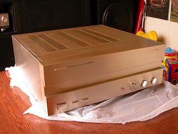 | さて、オーディオユニオン千葉店で見かけたAX-900は値札もなく、天板の一部とサイドパネルが外された状態で放置されていた。その様子からして、売りものではなさそうだ。早速、店員さんに訳を聞いてみたところ、ジャンク品なのだそう。実は現在、お客の依頼でAX-900を修理に出しているらしい。しかしながら、同機は発売から11年も経過しているため、ビクターの修理センターにも補修部品がないそうなのだ。そのためのパーツ取りとして、たまたま廃棄処分として客から引き取った壊れたAX-900を保管しているらしい。メーカーであるビクターには、AX-900の補修パーツはコンデンサーや抵抗などはいざしらず、外装ケースなどの予備パーツは全く残ってないらしい。そのことは、自分のAX-900を修理に出した時に聞いていた。同店に持ち込まれ、ビクターへ修理に出しているAX-900はスピーカーターミナルが破損しているらしいが、そのパーツもやはりビクターには残って無いらしい。左下の写真が店の棚に置いてあるジャンクのAX-900。右下は私が使っているAX-900。 | ||||||||||||||||||||||||||||||||||||||||||||||||||||||||||||||||||