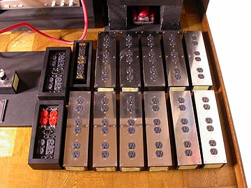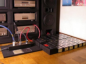 自作電源BOX一斉比較試聴の準備よし! 2004.12.24の巡礼記「自作電源ボックスの最新作」でも紹介したステンレスプレート6個口電源ボックスの一斉比較試聴の準備が整った。現在、電源ボックスを1台ごとに2 時間くらい通電し、エージングしている最中である。さてさて、今日の昼辺りから大音量での比較試聴ができるかな。 |