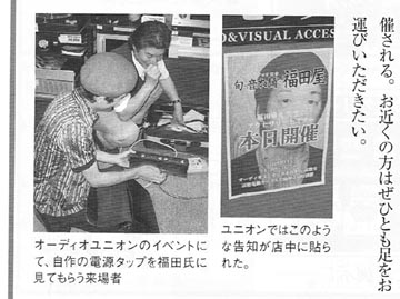 そうそう、他にも自分が映ってる記事があったなぁということで、手持ちの雑誌を漁っていたら、あったあった!それが右上の写真。AA誌110号383ページの緊急レポートコーナーの「福田屋イベントが大盛況 全国各地で好評開店中」と題した福田雅光先生のオーディオイベントのレポート記事に添えられている写真だ。どちらの写真もしゃがんで、しかも横からの写真というところが面白い。 |