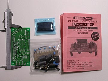 | こちらはカマデンのデジタルアンプキット。型番はTA2020KIT-SPという。ステレオアンプだ。価格は\6,000だ。若松通商秋葉原駅前店で売っている。このデジタルアンプキットについては月刊ステレオ誌にも製作記事が掲載されていたりしたので知っている人も多いだろう。安価ながら相当な音質を奏でると言ううわさを耳にする。特にバッテリー駆動させると良いそうだ。電源はDC12Vなのでバッテリーの選択には困らないだろう。個人的には鉛蓄電池を組わせたいと思っている。TA2020KIT-SPのキモになるデジタルオペアンプICにはトライパスのTA2020が使われている。これもデジタルアンプICとして良く知られているICだ。出力は20W×2。TA2020KIT-SPはTA2020KITのスペシャルバージョンで、コンデンサーとインクダンスを高級仕様に変更している。コンデンサーはエルナー社のもののようだ。基盤の大きさは50×100と極小。若松通商にはこのキットを組んだ完成品も\10,000/台で販売している。私がなぜこのデジタルアンプキットを購入したかというと、完全自作のバッテリー駆動ニアフィールドリスニングシステムを構築しようとしているからだ。そうなると小型低消費電力のデジタルアンプが候補に挙がり、カマデンのキットに辿り着いたというわけ。このキットも買ったままほったらかしにしているのでそろそろ作らんとなぁ。 | ||||||||||||||||||||||||||||||||||||||||||||||||||||||||||||||||