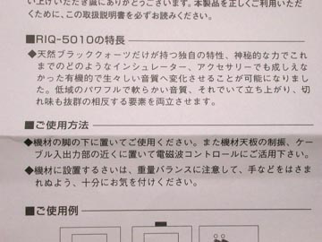 | これはアコースティックリバイブのブラッククオーツインシュレーターRIQ-5010。天然の黒水晶を円形上に切り出したインシュレーターだ。4個セットで実売\30,000弱と高価だが、私は\17,000で中古入手した。これ、ステレオ誌で田中伊佐資氏がレポートしていたインシュレーター比較試聴記事を読んでからというもの、欲しくてたまらなかったのだ。かといって、3万もの大金をポンと出せる程、私の財布は悠長ではない。そんなこんなで悶々としていると、たまには救う神もいるもの。オーディオユニオンお茶の水店の巡回時にこれを見つけたのだ。発見し即購入。あぁ、お得な買い物だった。 | ||||||||||||||||||||||||||||||||||||||||||||||||||||||||||||||||