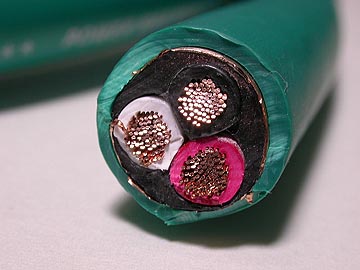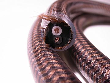 | POWERMAX5500の外形寸法はなんとφ15もある。ケーブルはけっこう軟らかい。色はご覧の通り青っぽいグリーンだ。エメラルドとでも言おうか。右上の写真を見ても分かる通り、ケーブルジャケットにはアコリバとオヤイデの共同開発だという印字がされている。価格は実売\3,500/m。手頃な値段だ。ケーブル径と導体断面積を鑑みるとやはり6N-P4030のよきライバルと言えそうだ。いずれ雑誌でも紹介されるだろうが、その前にぜひ音質レポートをしてみたい。 | ||||||||||||||||||||||||||||||||||||||||||||||||||||||||||||||||