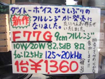 | コイズミ無線にダイトーボイスの新型フルレンジユニットが入荷。型番はF77G。価格は\1,360。9cm口径という珍しい大きさのユニットだ。フレームはご覧の通りプレスだ。能率は82.5dBとやや低め。コーンはポリプロピレン系だろうか。ダイトーのユニットは飾りっけのない明るい音がするのだが、これもそういった傾向の音色のようだ。TBが台頭してきている昨今、ダイトーもよほど目新しいユニットを出さないと、マニア受けしないだろう。ま、もっともダイトーユニットの主な流通先は電気メーカーへのユニット供給だと思われるので、オーディオマニア向けの小売りに注力はしないだろう。 | ||||||||||||||||||||||||||||||||||||||||||||||||||||||||||||||||