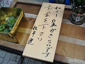 | いかにも怪しい。机上を覗き込むと、右上のような札が置かれていた。「私くし仕事がきらいです お金をください 松平建」と書かれている。うーん謎だ。さらに謎なのが、卓上に置かれている空き缶。中には水が張ってあり、ホテイアオイが浮いている。よく見ると金魚が泳いでいるではないか。黒い出目金と赤い金魚が1匹づつ。そういえば、ここには昔から酒飲みのおじさんが座り込んでいて、街行く人々に絡んでいるのをよく見かけた。ここの主はたぶんそのおじさんだろう。 | ||||||||||||||||||||||||||||||||||||||||||||||||||||||||||||||||