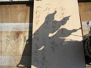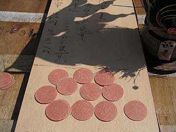 | 卓上の札も更新されていた。解読すると「お酒代です。カンパお願い致します。一.神田明神様・・・ここにいます。二代将軍徳川秀忠公」と書かれている。うーむ、よほどお酒が好きらしい。そして、誰かのカンパなのだろうか、φ40薄さ1mmほどの謎の物体が十枚ほど置かれていた。食べ物なのだろうか。酒の肴にどうぞ、と誰かがカンパしたのだろうか。形状からすると、オーディオ用の薄型インシュレーターにも似ているが、似て非なるものとはこのことだ。たぶんこれは食い物だ。