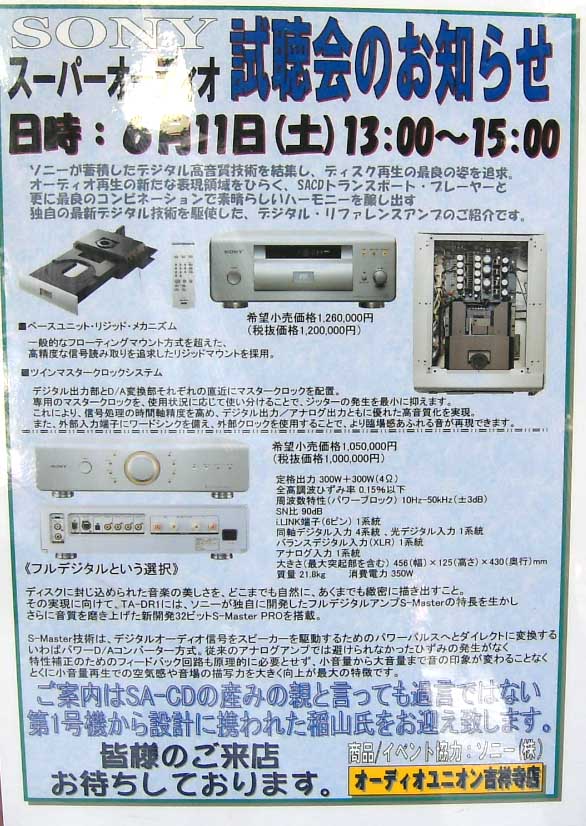 | こちらはオーディオユニオン吉祥寺店でのイベント。今回の試聴会では、話題のデジタルアンプ ソニーTA-DR1が聴けるのだ。組み合わせられるのは、当然ながら同社のSACDプレーヤーSCD-DR1。設計者もお越しになられるので、これも見逃せないかも。本日時点で、すでに現物が吉祥寺店に搬入されていた。プリメインアンプとSACDプレーヤーという、いたってシンプルな取り合わせなのが、妙に新鮮だったりする。こちらも予約制らしいので、興味のある方はオーディオユニオン吉祥寺店にお問い合わせしてみるべし。吉祥寺店はこういったミニイベントを頻繁におこなっている。 | ||||||||||||||||||||||||||||||||||||||||||||||||||||||||||||||||