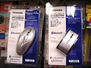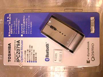 | こちらはBluetoothマウス。PowerBookG4にはBluetoothが標準内蔵されているので、Bluetoothワイヤレスマウスが使える。Apple純正のBluetoothワイヤレスマウスもあるのだが、スクロール機能の無い1ボタンマウスなので、使い勝手が悪そうだ。となると、サードパーティ製を探すしか無い。しかしながら、どこのMac専門店を探しても、サードパーティのBluetoothマウスは1〜2種類しか扱っておらず、デザインも悪く、小さすぎたり、大きすぎたりして使い勝手が悪そうだ。なんとかならんものかとネット検索していたら、TravellersInnというブログでMacで使えそうなBluetoothマウスの特集記事を発見。ここには沢山のBluetoothマウスが紹介されている。その中で、東芝のIPCZ079AというBluetoothマウスがデザイン的にも大きさ的にも気に入った。東芝の製品紹介ページを閲覧してもMac対応とは謳われていないのだが、Powerbook会議室というサイトを閲覧してみると、IPCZ079AはMacでも使えると書いてある。そうなると居ても立ってもおられない。いざ秋葉へ行かん。秋葉原のパソコン店を駆け巡ること十数件。どこにもIPCZ079Aを扱っている店がないのだ。パソコン店の店員さん曰く「これは東芝dynabookユーザー向けに製品化されていますので、一般流通はしてないですね」とのこと。こうなったら、秋葉にある東芝直営の修理センターに行って聞いてみるしか無い。東芝修理センターの社員さんにIPCZ079Aの扱い店を尋ねたところ「秋葉原のチチブデンキに置いてございます」とのこと。 | ||||||||||||||||||||||||||||||||||||||||||||||||||||||||||||||||