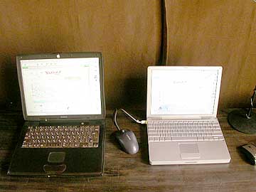 その後、AirMacベースステーションも購入したので、自宅での無線環境は整った。さらに、ホットスポットにも加入したので、外出時のネット環境も確立できた。これにて、私のモバイル環境は一件落着。ちなみに、この記事もホットスポットを経由してアップしている。現在の私のパソコン環境は右上写真の通り。オーディオみじんこを管理する都合上、万が一のことを考えて、パソコンは2台体制に。引き続きPowerBookG3は自宅専用として残し、PowerBookG4は常に持ち歩いている。 |