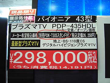 | こちらは中野のフジヤエービックに並んでいたパイオニアの43VプラズマテレビPDP-435HDL。たしかこれ、ごく最近まで現行品だったんじゃないかな。298,000円とはお値打ち価格だ。液晶テレビの台頭し、また、フラットテレビの価格自体もここ1年の間にずいぶん値下がりしたので、現在は43Vで30万円くらいが妥当なのだろう。私が見かけたのは先週。同機が2台展示処分されていた。 | ||||||||||||||||||||||||||||||||||||||||||||||||||||||||||||||||