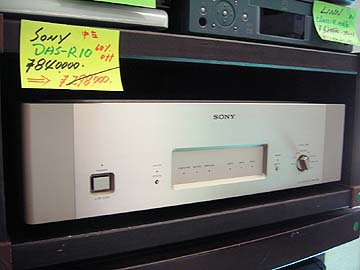 | さて、いきなりダイナミックオーディオ新宿店です。9月上旬のこと、ソニーの隠れた名D/AコンバーターDAS-R10を発見!うーん、このなんともいえないシンプルさがいいですなぁ。DAS-R10は1993年発売の同社最高級DAC。CDトランスポートCDP-R10(\1,200,000)も同時発売されており、ペアで2,000,000円というソニー最上級のセパレートCDPだった。この価格からして、それほどの数が売れたとも思えず、中古でもほとんど見かけることはない。半年くらい前にオーディオスポットカマニで見かけて以来だ。