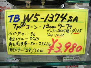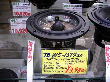 | 9月初頭。さて、こちらはコイズミ無線に入荷したTBの新型スピーカーユニット。13cmの透明ポリプロピレンコーンウーハーで、型番はW5-1374SA。六本木工学研究所の方からお聞きした話なのだが、このユニットは六本木工学研究所の強い働きかけによって製品化されたらしい。なんでも同社の社長が透明コーン好きらしく、従来に無い透明度の高いユニットをTBに切望されたらしい。たしかに、従来の透明ポリプロピレンコーンは半透明という感じだったが、W5-1374SAは全くの無色透明。向こう側が完全に透けて見えるユニットは初めてかも知れない。有色無色に限らず、ポリプロピレンコーンは音色傾向としてはまろやか系らしく、ペーパーコーンとは対局の性格らしい。私も何度かTBやUSHERのポリプロピレンコーンユニットスピーカーを試聴しているが、総じて穏やかな印象を受けた。私的にはペーパーコーンの快活さの方が好きだ。 | ||||||||||||||||||||||||||||||||||||||||||||||||||||||||||||||||