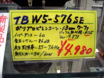 | こちらもTBの新型ウーハーW5-576SE。W5-1374SAとフレームは同一。スペックには違いがある。ひとところ落ち着いていたTBだが、また立て続けに新製品が出てくるのかなぁ。かくいう私はTBのユニットを一度も使った事が無い。魅力的なユニットが幾つもあるので、いつか使ってみたいとは思っている。余談だが、FOSTEXのマグネシウムコーン8.5cmフルレンジはまだまだ先の話になるようだ。技術的なこと以外にも色々とあるらしく、製品化されるかどうかも不明だ。 | ||||||||||||||||||||||||||||||||||||||||||||||||||||||||||||||||