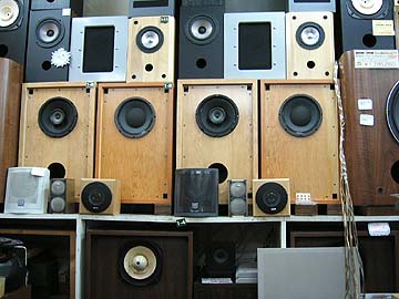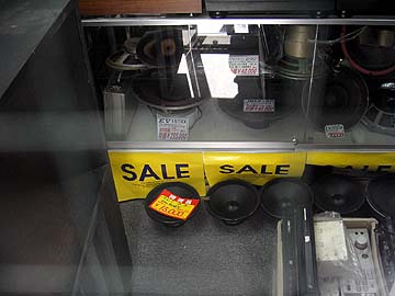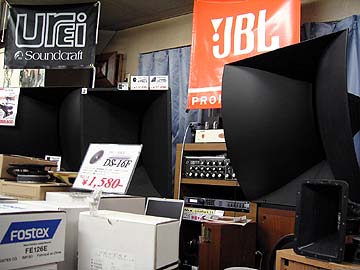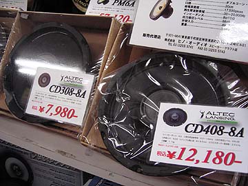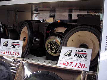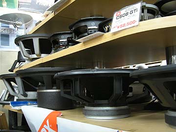 | 秋葉原広しといえども、ラウザーのユニットを常時扱っているのはヒノオーディオだけだろう。なんともマイナーなブランドだが、これはこれでコアな愛好者がいるのだ。アルニコの巨大マグネットが独特。見た目はいかんともしがたいが、音はいいらしい。こういう珍ユニットに手を出すのは、オーディオの酸いも甘いも知り尽くした人のみに許されるのかもしれない。右は大型ウーハーの陳列棚。フォステクスの38cmウーハー15W400のフレームが目を引く。頑丈そうなユニットだが、値段はたったの2万弱。 | ||||||||||||||||||||||||||||||||||||||||||||||||||||||||||||||||