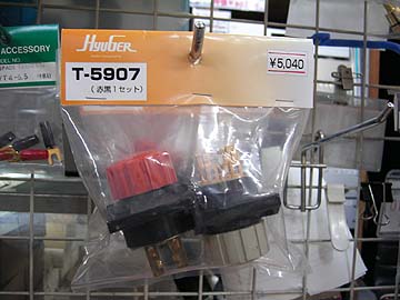 | スピーカークラフト店にはこのような巨大スピーカーターミナルも売られている。他店では見かけない。これはT-5907という型番が付けられており、同店のオリジナルブランド“HyuGer”の札が付けられているが、同店のオリジナルでは無かったと思う。このターミナル、見覚えのある方も多いだろう。そう、このターミナルは1990年代頃、LUXMANのパワーアンプなどに採用されていたものだろう。