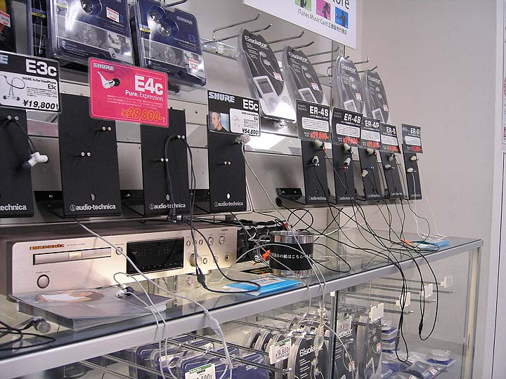 | こちらは秋葉原のラオックスMac館の1階。壁一面に国内外のインナーイヤー型、カナル型イヤホンなどが陳列されている。全てヘッドホンアンプへ接続されており、常時試聴可能。なんと言ってもありがたいのは、シユアーとエティモティックリサーチのカナル型イヤホンが全て試聴できることなのだ!写真には納めていないが、オーディオテクニカやKOSS、SONYなどもずらりと並べられている。 | ||||||||||||||||||||||||||||||||||||||||||||||||||||||||||||||||