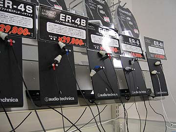 左はエティモティックリサーチのカナル型イヤホン。シュアーとエティモティックリサーチが一斉試聴できるお店は、私の知る限りここだけだ。シュアーは比較的流通しているため珍しくはないが、試聴できるというのはありがたい。なにより、エティモティックリサーチを店頭販売しているのが貴重。エティモティックリサーチのERシリーズと言えば、ヘッドホンマニアの間で相当話題になっているカナル型イヤホンで、私も同社のER-4Sを愛用している。 かねがねやりたったERシリーズの比較試聴。私は嬉々としてER-4P/ER-4B/ER-4S/ER-6i/ER-6を試聴した。他人の耳に挿し込まれて黄色くなっていようが、そんなこたぁ気にしない気にしない。この5種類、それぞれ音が違う。ER-4P/ER-4B/ER-4Sではインピーダンスがかなり違えてあり、誰が聴いても音量レベルの違いがはっきり分かる。ER-4S<ER-4B<ER-4Pの順で音量が上がる。ER-4Pはインピーダンスが低く設定されているので、小さな入力信号で大音量再生が可能だ。元気の良さが気持ちよく、中高域がビシバシと突き刺さる感じ。たしかにポータブルオーディオ向きだろう。反面、粗っぽさも感じる。ER-4Bはバイノーラル録音のソース試聴に特化した型番。これは緻密な描写が特徴的。ER-4Pより小さいがER-4Sよりは若干大きい。お次は、私も常用しているER-4S。ER-4Pを聴いた後では、ER-4Sは音が小さすぎると感じてしまう。ただ、ボリュームを上げれば問題は無く、帯域の誇張感や癖も感じられず、バランスの良さではERシリーズで僅差で一番かも。ER-6は安価だが、ER-4Sに迫る解像度で、コストパフォーマンスが高い。 野外でも屋内でも使い、特にクラシックやジャズなどの高音質ソースをリアルに聴きたい人にはER-4Sが無難だ。演奏者の靴が床と擦れる音とか、ほんの小さなささやきとか、あれ?こんな音まで入っていたのか!とびっくりすることもある。ER-4Sは音質面にさほど配慮されていないソースの再生においては、ただのカナル型イヤホンでしかない。ところが、優秀録音のライブや高音質録音盤などを再生すると真価を発揮する。 ロックやポップスなどの音楽を聴くなら、バリバリ鳴りまくるER-4Pを選択した方が良さげ。ただ、あまり調子に乗りすぎて大音量再生しすぎると、一時的な難聴になり、それが重なると本当の難聴になる危険がある。カナル型は密閉型なので、音の逃げ道が無く、鼓膜を痛めやすいのだ。 意外だが、一番魅力的だったのはER-4Bだ。ER-4SとER-4Pはネット上でもてはやされている分、ER-4Bは特殊用途を前提としているため購入者が少ないのか、あまり話題にならない。ER-4Bは、ER-4Sを少し濃密にした感じかな。ま、これらは私が感じたことで、マニアの方の中にはもっと違う意見があるかも、いや、異論があって当然だ。 |