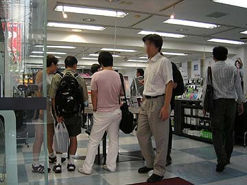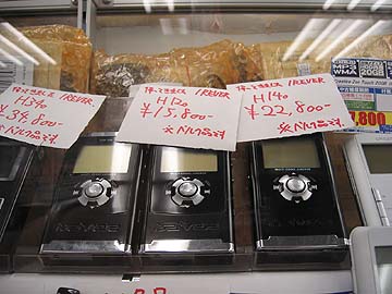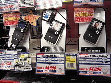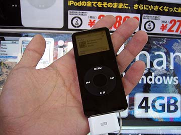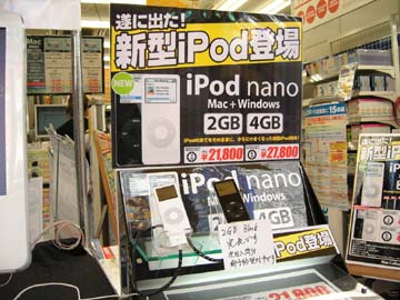 | なぜにオーディオ店ではなく、パソコン店でこのような陳列がなされているかと言えば、iPodがあるからに他ならない。右は先日発売されたばかりのiPodnanoに群がる人々。