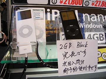 | 秋葉原ソフマップのMac専門店店頭展示。黒モデル/白モデルともに2GB/4GBがある。2GBが21,800円、4GBが27,800円。どの店も同じ価格だ。iPodnanoは発売初日で、ほとんどの店で完売。 | ||||||||||||||||||||||||||||||||||||||||||||||||||||||||||||||||