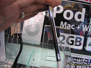 | iPodnanoはご覧の通り、とても小さい。しかも極薄。これは音楽データの記憶装置にフラッシュメモリーを採用したから。黒モデル/白モデルともに表面は艶あり。個人的には黒モデルに惹かれる。艶消し黒モデルなんかがあったらかっこいいのになぁ。背面の銀色部分はステンレスではなく、樹脂製だ。 | ||||||||||||||||||||||||||||||||||||||||||||||||||||||||||||||||