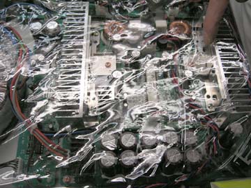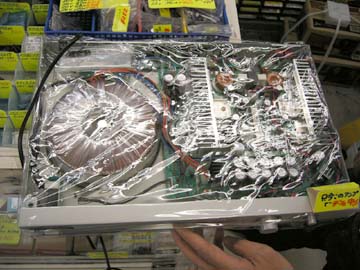 | ビニールが反射して内部がうまく撮影出来なかったが、この基盤の真ん中にトライパスのICが搭載されている。この薄型ケースには、トランス、フロントパネルLEDコントロール基盤、ボリューム関連の制御基盤、アンプの基盤、入力端子関連の取り付け基盤、スピーカーターミナル関連の基盤が全てネジ止めされている。この中身を見る限り、同社のスタジオ用パワーアンプDA04に良く似ている。強者ならば、このDA55を購入して、自前できちんとしたケースと端子類を用意し、中身をそっくり移し替えてやるなんてこともできるかもな。ま、気になる人は若松通商秋葉原駅前店にどうぞ。 |