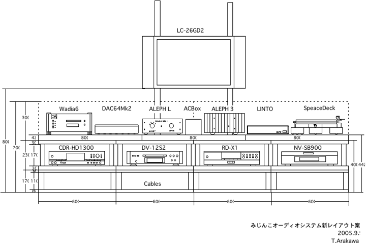 | んで、ようやく落ち着きつつあるのが、上の図案。難題であった液晶テレビの設置方法は、株式会社ヒガシというメーカーのHPseries+という長大な突っ張り棒を用いて壁掛け設置することに落ち着きそうだ。今回のみじんこピュアオーディオ機器は横幅が300mm程度のミニサイズに揃えている。これらの機器は横並びに設置。その台座となるべきオーディオラックは、横幅600mmのものを4列横並びに設置。横幅総延長2,400mmのラック天板部分にオーディオ機器類を設置する。2,400mmというと、みじんこの6畳間リスニングルームのオーディオシステム設置幅ぎりぎりぴったりの寸法だ。ラック自体には防振効果を持たせた構造とし、オーディオ機器への振動伝達を減衰させる。ラック内部には、薄型のAV機器類を設置。ラックの下には、オーディオアクセサリーを収納する引き出しを設置し、ケーブルやクリーナー、インシュレーターなどの小物類を収納し、必要な時にすぐに取り出せるようにする。 | ||||||||||||||||||||||||||||||||||||||||||||||||||||||||||||||||