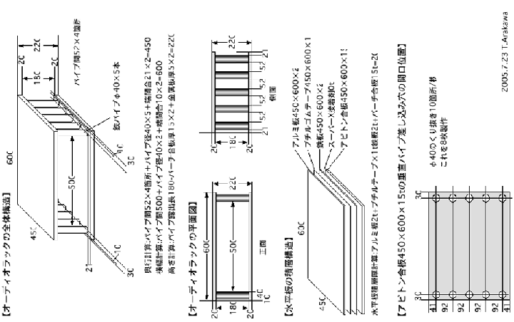 | 図が横になっているので、見づらいですがご勘弁を。設計が煮詰まりつつあるオーディオラックの設計図。オーディオラックの天板と底板はシナアピトン合板を使用。金属板や防振ゴムなどをサンドイッチし、振動の制御を図る。さらに、天板と底板を繋げる垂直方向の部材には、真鍮パイプかステンレスパイプを使用。パイプ内部にはジルコンサンドを充填。上下双方からの振動伝達を、このパイプ部分で減衰させる。合板はマキゾウさんに依頼しようと思っている。電話帳やネットで、近所の金属加工会社を探し出し、アルミ板や銅板の入手先は確保した。問題は金属パイプの入手とカットだ。私はパイプをカットできる機材を持ち合わせていないし、高精度なカットとなると、業者に委託した方がよさそうだ。この業者も最近なんとかメドが付きそうで、今後は見積もり交渉に入る。設計図には載せていないが、ラックにはガラス板も用いる予定で、これも電話帳を元に、近所のガラス屋を手当り次第に訪問、安くガラスカットしてくれるお店を見つけた。このように、素材一つ一つの入手先を探しながらのラック設計なので、時間が掛かる。きっとお金も掛かるだろう。これらの防振設計は私の素人考えなのだが、素人だからこそ、メーカーではやりずらそうな複数素材の組み合わせなどにもチャレンジ出来る。 | ||||||||||||||||||||||||||||||||||||||||||||||||||||||||||||||||