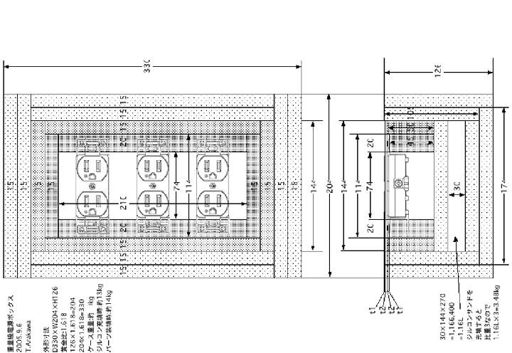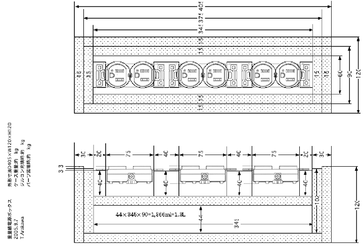 | 上述の黄金比電源ボックスはちょっと大きすぎたので、もう少しスリムな電源ボックスも設計してみた。この電源ボックスはコンセントを縦並びにすることで、横長の電源ボックスとして設計している。下部には1.3Lほどの密閉された内部空間を設け、この中にジルコンサンドなどを充填し、重量付加を図る。