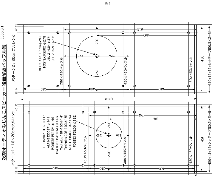| こちらはスピーカーの設計図。正面設計図のみなので、何がなんだかわかりずらいが、これは後面解放スピーカー。高さ1,200、幅450、奥行き300ほどの大型スピーカーだ。このスピーカー、実は子供のいたずら防止用のオーディオ機器カバーも兼ねたスピーカーとなっている。使わない時は、オーディオ機器にすっぽり被せるのだ。オーディオ機器類に被せるいたずら防止カバーを何かに利用出来ないかと考え抜いた末、カバー自体をスピーカーにしてしまおうと思いついたのだ。フロントバッフル面は3分割されており、自在に脱着が可能とする。バッフルを分割する事で、後面解放や平面バッフルの弱点である共振を極力排除するという意図もある。すでにこのスピーカーに搭載するユニットとして、JBLの30cm同軸2wayユニット2142Hを入手済み。30cm同軸ユニット搭載の後面解放スピーカーによるニアフィールドリスニングという、非常識きわまりないオーディオ環境が整うことになる。後面解放にはメリットとデメリットが混在するのだが、今の私にはデメリットもメリットになりうる可能性がある。一番大きいデメリットは低音が出ないことだが、これは至近距離で聴く事である程度克服出来るし、現在の私の住環境ではあまり低音がドスドス鳴りすぎても困るのだ。ま、ここらへんの諸事情は説明すると長くなる。このスピーカーが実用に堪えうるのかどうかもまだわからないので、後面解放の詳細についてはまた後日ということで。