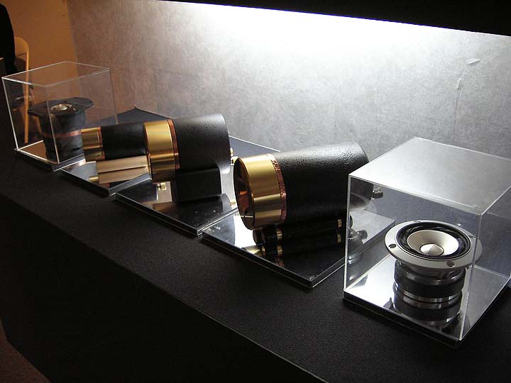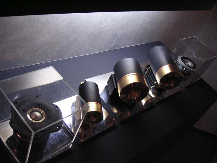 | 左はマグネシウム振動板フルレンジユニットMG850の試聴用スピーカー。私は残念ながら、時間の都合で聴けなかったのだが、RS-2と交互に定期的に鳴らすらしいので、興味のある人はぜひ行ってみて、聴いてみてください。左は同社の現行ユニット群。手前はRS-2に搭載されているユニット。RS-2に使われているユニットの単売はしていない。