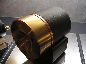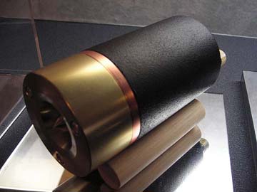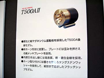 | こちらはT500A||をさらに長くしたモデル。限定販売か?このユニットの原型は、昨年のAVフェスタでも展示されていた。同社の和田さんによると、開発陣が改良に改良を重ね、銅などの素材を追加する事によって、ようやく完成をみたという。右はT500A||の試聴状況。同社の新型完成品スピーカーRS-2 の天板に載せられている。これは実際に聴く事ができた。RS-2との組み合わせの音なのだが、明らかにT500A||の存在感が感じられる。RS-2も素晴らしいスピーカーだが、このT500A||の瞬発力と浸透力は凄まじい!スーパーツイーターここにあり!という感じで、ものすごい瞬発力を有していた。まさに、音速というものを体全体で感じることができる。音を作り出す装置といった存在感だ。最近、ムラタやテイクテイを代表として、新方式のスーパーツイーターが次々に発売されており、それらにはそれなりの効果があるとは感じるのだが、私はやはりこの伝統的なホーンツイーター形式に、音的にも外見的にも惹かれる。 | ||||||||||||||||||||||||||||||||||||||||||||||||||||||||||||||||